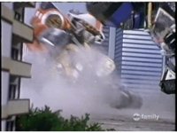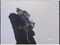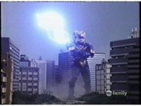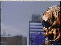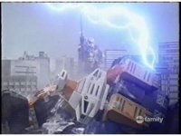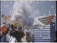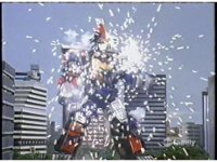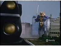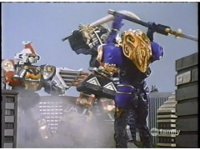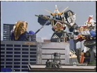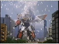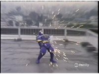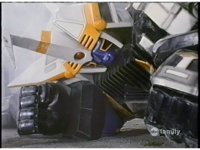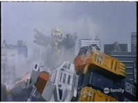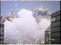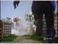 Pan up Ninja Megazord as it staggers back, smoking. |