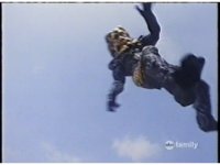 Red Ranger falls from the sky, upside down, kicking his feet and grabbing at the air. |