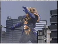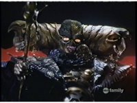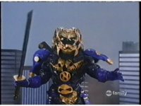 Ninjor-Globbor is just about to slash into Ninja MegaFalconzord, when Shogun Megazord reaches in and grabs the blade. |