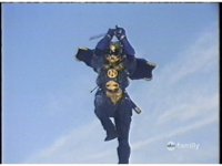 Another shot of White Ranger falling straight down through the sky, with Saba held outward. |