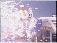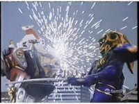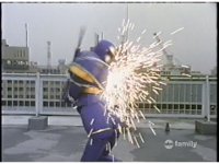 Side angle as Blue Globbor punches left fist into Ninja Megazord, with sparkily results. |