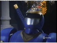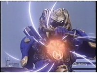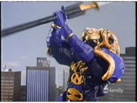 Blue Globbor sparkily strikes Ninja Megazord, causing it to stagger back. |