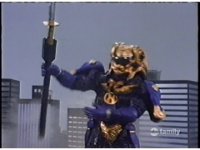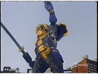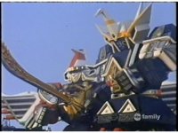 A flash, flare and shimmer of energy, as Shogun Megazord, Saber raised high, slowly steps forth and slashes flaming blade diagonally downward. |