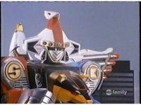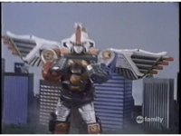Ninja Megazord flies through the sky slowly. Zoom in on it as the White Falcon soars in and hovers above its back, causing a rapid flashing of light. |