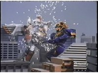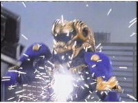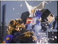 Side angle on Ninja Megazord, as it gets sparkily punched by the monster, knocking it back. |