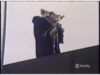 Slight zoom in upward onto Master Vile, facing our right on roof's edge, talking and raising arms. |