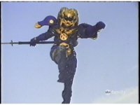 Against a multicolored backdrop, Ninja Megazord, in slow motion, punches the Blue Wolf fist into the screen, rapidly intercut with an image of the vicious Blue Wolf Ninja Spirit. |