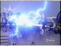 Ninjor-Globbor thrusts blade forth, firing bluish electrical bolts into the two Megazords, causing bright spark explosions. |