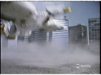 Falconzord and the Ninja & Shogunzords all flare with a green glow, that fades with them, teleporting the trio away, just before Ninjor-Globbor lands on the spot where they were. |