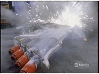 Close on the downed, lifeless Falconzord as it spark bursts rapidly. |