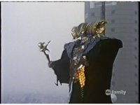 Slow zoom in on Master Vile on roof edge, talking as he raises hand, then juts staff forth. |