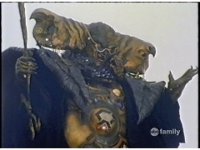 Close on Master Vile, talking to our upper right, motioning staff about, clenching fist and raising it up. |