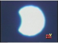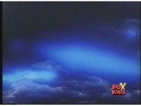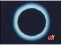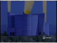 Command Center exterior, close, ground level angle, under an eclipse night. The building glows blue, then fires a golden spotlight beam skyward, followed by two more, turning it almost into the original Fox Children's Network logo. |