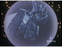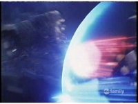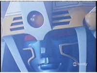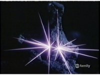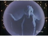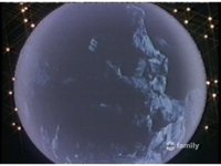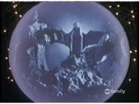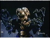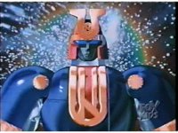 Upward close on AquiGlobbjor, spark bursting, until he crackles with electricity, glows green, and several balls of light fly off of him. A flash of light and fade of the green, as he reverts to plain old, but still giant, Blue Globbor. |