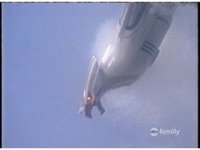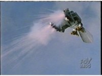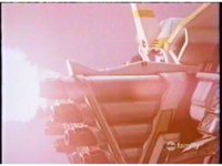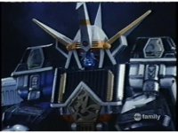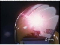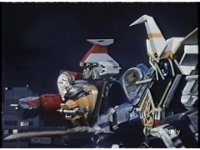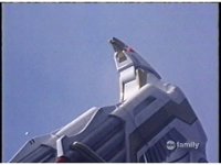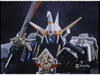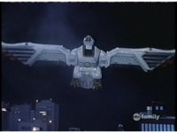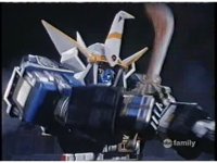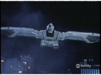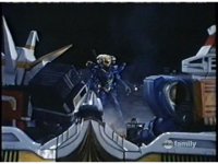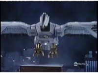 Zoom in on the flying Ninja Megazord as the White Falcon soars in and hovers above its back, causing a rapid flashing of light. |