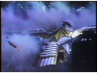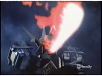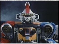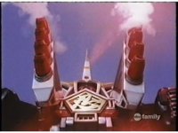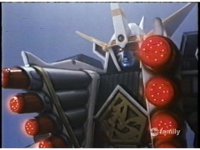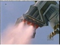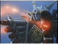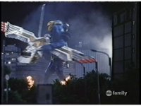 Slow push out from Shogun MegaFalconzord's face, as its chest-based wingtip cannons begin to glow red. They suddenly begin a rapid, bright, smoky and flashy barrage of laser fire from varying angles! |
