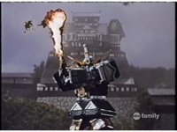 As Shogun Megazord motions flaming saber around in a circle, bracing it against side with both hands, before a flaring of power, the backdrop is a long POV push in across an old style Japanese village onto a castle that resembles the Shogun Megazord. |