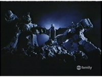Close on Ninjor, lying on the foggy floor, weakly moving head. |