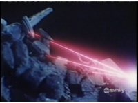 Side angle on the stone-rusted Zord trio, as they fire beams of pinkish energy from their eyes into a concentrated beam that fires to our right. |