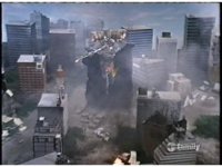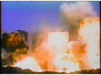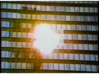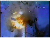 Side of mirrored-windowed building erupts with superimposed explosion. |