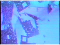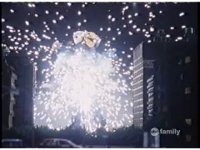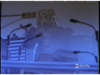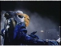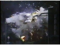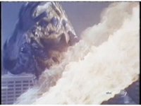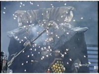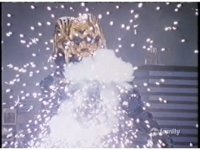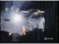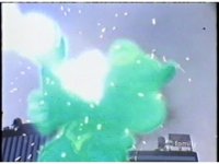 Master Vile sits watching his view screen, as a scene of Japanese people fleeing a burning, then exploding, building causes him to sit up, the view screen then shows said building re-exploding close-up. |