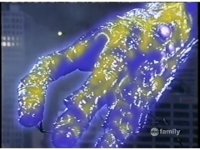 Close-up on Ninjor-Globbor's oversized, drippy, tentacled-finger right hand, briefly glowing blue & gold. |