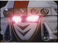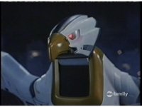 Close-up on the stone-rusted White Falconzord, its eyes flashing and glowing with pinkish energy. |