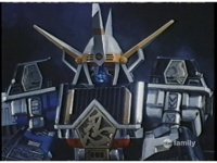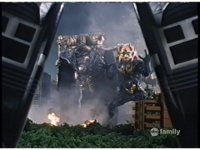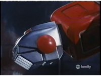 Extreme close-up of Shogun Megazord's left eye, Falconzord reflected in it. Quick zoom out and track around to behind Shogun Megazord, showing it facing the approaching Falcon. |