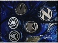 The six Power Rangers stand together in a gold & black rippling circle, spreading arms out, lightning strikes them, and in a flash, their suits turn to the glittery Metallic Armor modes, causing them to cross their arms down. |