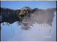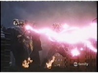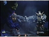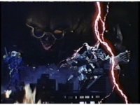 Distant side angle, on AquiGlobbjor facing the Ninja & Shogun Megazords, and Falconzord, across the city. Reddish lightning crackles about the dark sky, onto the city. Master Vile's head appears in the sky, laughing, as the lightning causes the flames at the bottom of the screen to grow in intensity. |