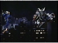Distant side angle on AquiGlobbjor patiently facing the Zord combination trio across the dark and fiery city. |