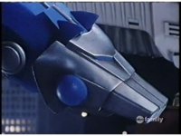 Close-up on Shogun Megazord's Saber, as a blade of flames spews out from the fish's fanged mouth. |