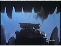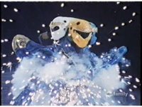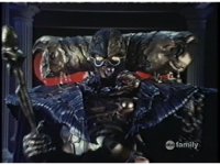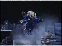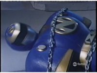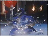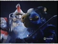 Against a multicolored backdrop, Ninja Megazord, in slow motion, punches the Blue Wolf fist into the screen, rapidly intercut with an image of the vicious Blue Wolf Ninja Spirit. |