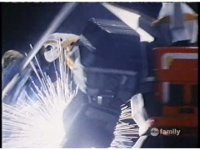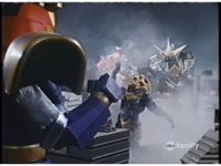 Zoom out from its power-sparking fists, as Shogun Megazord lowers arms, energy flashes and flares, its Blue & White arms briefly slide off to the sides, allowing Falconzord to slip its wings into the torso section, before the arms reattach over them. Flares of smoke and rings of power sparkle about, as the completed Shogun MegaFalconzord raises arms. |