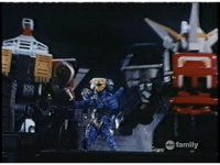 Zoom out as Blue Globbor falls, rolls, and gets back up to find the pair of Megazords behind him. |