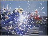 Repeat, closer, on Shogun Megazord slashing flaming blade of its Saber diagonally downward through the screen. |