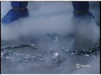 Sharp zoom out as Ninjor jumps up and shakes off his chains. |