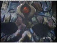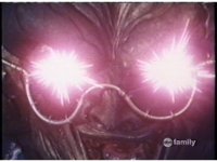 Extreme close-up on Master Vile, as his eyes flash and flare with pinkish energy. |