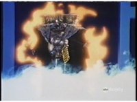 Extreme close-up of Ninjor's face, as an explosion reflects upon his visor, followed by animated flames raging upon the bottom. |