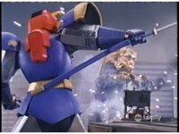 Close side shot of Ninjor Battle Mode butting the butt of his extended-sword into Blue Globbor's neck, knocking him away. |