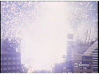 Edged side of tall building erupts with superimposed explosion that flares screen right then bright white as it expands. |