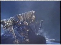 Close on Ninjor, chained and talking as he looks to our upper left, pan upward left to Master Vile, raising staff and talking to our upper left. |