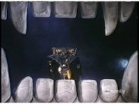 Rear shot of Master Vile standing in the Skull Ship's open jaws as it continues to rise up. |