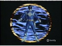 Blue Ranger, then Black Ranger, stands in a gold & black rippling circle, spreading arms out, lightning strikes him, and in a flash, his suit turn to the glittery Metallic Armor modes, causing him to cross his arms down. |
