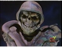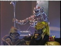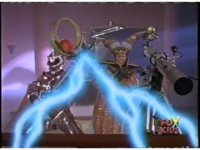 Goldar talks while looking beside Repulsascope, he then backs up and away, as Zedd & Rita walk up balcony steps, cross staves, and release flashing bolts of combined lightning energy forth while shouting, "Grow, monsters, grow!" |