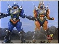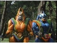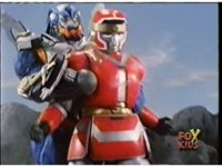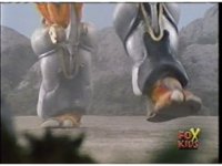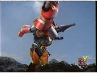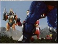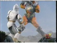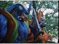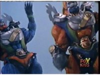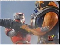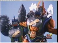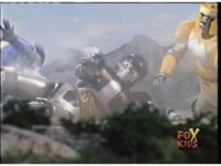 Cuts follow-up sequence of Red exiting Borg's forehead, the Rangers leaping over and entering Shogunzords, Barbarics reacting to the Shoguns, then the Shogunzords standing around. |