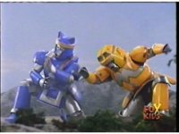 Blue & Yellow Battle Borgs fall and roll, quaking the area, then get up in weak crouches. |