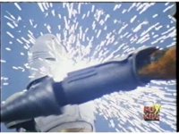 Close on White Battle Borg getting sparkily struck by Merrick. |