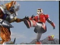 Zoom out from Red Alien Ranger, resting his sword on his right shoulder, as his teammates regroup around him. White touches his other shoulder, nod-talking to him, he pushes her arm away casually, as she looks forward. |