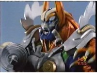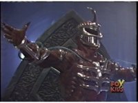 Close on Shogun Megazord, zoom in on its face as it tilts head forward, lightning flashing off-frame. |